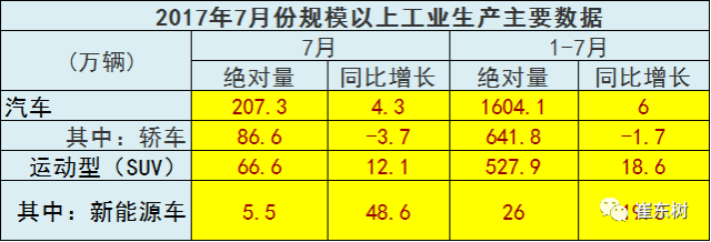 17年1-7月消费结构进一步放缓,轿车增速负增长,SUV保持高增长,SUV对轿车分流逐步弱化。根据国家统计局数据,1-7月新能源汽车生产26万台。同比增长20%,恢复较快增速。