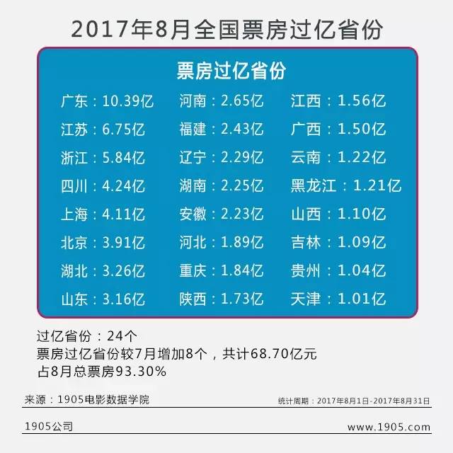 地区方面,由于本月单月票房较高,票房过亿的省份由以往平均的15个左右,增加到24个,相较7月增加8个。其中,四川超过上海、北京,以4.24亿排在第四位,吉林省与贵州省则今年首次过亿。