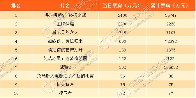 中商情报网讯:根据初步统计,周五大盘报收6950万;猩球崛起3:终极之战2400万,累计5.57亿;王牌保镖首日2236万(含首映场36万);看不见的客人745万,累计7107万;蜘蛛侠:英雄归来600万,累计7.24亿;请把你的窗户打开139万,累计1375万;纯洁心灵·逐梦演艺圈首日122万。
