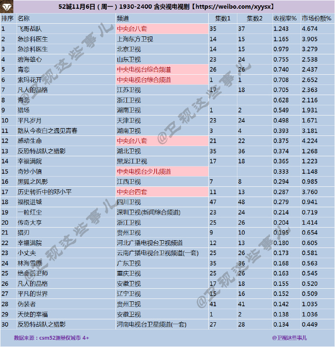 中商情报网讯:11月6日(周一)CSM52城收视率排行榜上中央八台《飞哥战队》位居榜首,昨日收视1.243%,市场份额4.674%。东方卫视《急诊科医生》收视第二,当日收视1.165%,市场份额3.905%。北京卫视《急诊科医生》周一收视0.979%,市场份额3.279%,排名第三。山东卫视《碧海雄心》当日收视0.755%,市场份额2.538%,收视排名第四。中央卫视《青恋》当日收视0.740%,市场份额2.437%,排名第五。