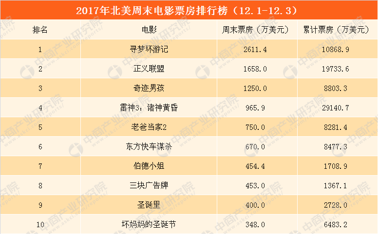 中商情报网讯:由[皮克斯]出品的《#寻梦环游记#》次周末三天收获了2611万美元的票房成绩蝉联冠军,上映10天票房累计1.087亿美元;《#正义联盟#》周末三天进账1658万美元下滑60%,上映17天累计1.973亿美元;《#奇迹男孩#》周末收获1250万美元,累计8803万美元,最终将轻松破亿;《#雷神3:诸神黄昏#》再收967万美元,累计2.914亿美元,破3亿美元指日可待。