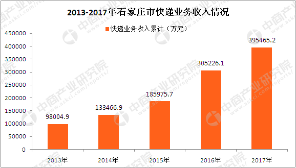 2017年12月份,石家庄市快递服务企业业务量完成4433.73万件,同比增长38.43%;业务收入完成4.56亿元,同比增长35.78%。2017年全市快递业务收入累计完成39.55亿元,同比增长29.56%。