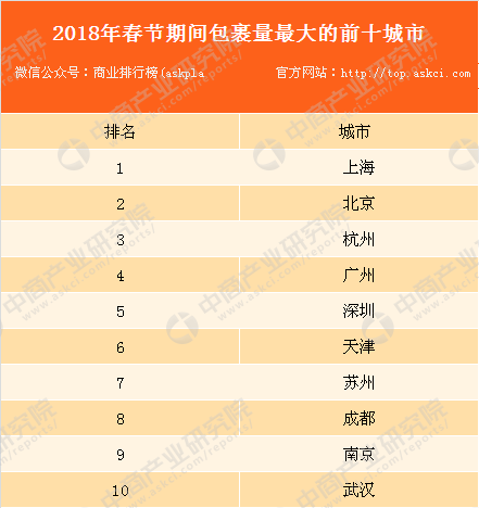 中商情报网讯:2月22日,据菜鸟网络发布的数据显示,春节期间上海、北京、杭州成为年货包裹量最大的城市。其中杭州作为准一线城市,春节包裹量超过了广州和深圳等一线城市。