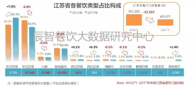 2017年江苏省中式快餐快速增长,在总共43.3万家餐饮门店中有43.1%的餐厅是中式快餐,一举超过中式正餐!