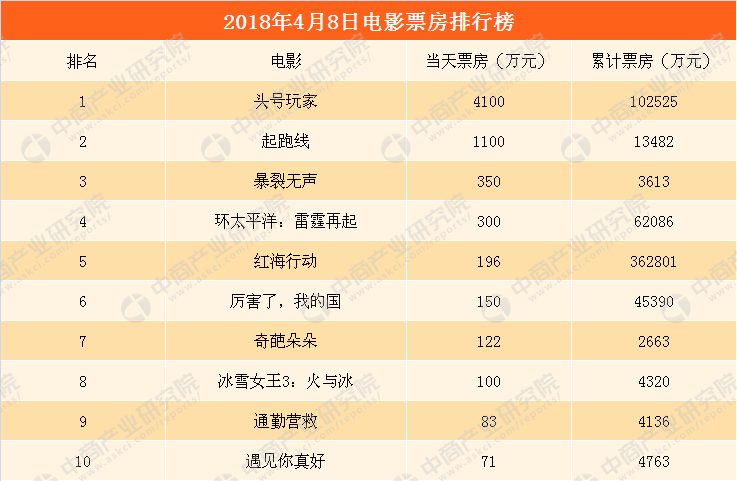 中商情报网讯:根据初步统计,周日大盘报收6950万;#头号玩家#4100万,累计10.25亿;#起跑线#1100万,累计1.35亿;#暴裂无声#350万,累计3613万;#环太平洋:雷霆再起#300万,累计6.21亿;#红海行动#196万,累计36.28亿;#厉害了,我的国#150万,累计4.54亿.