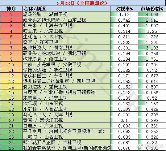 中商情报网讯:2018年5月22日(周二)全国网收视率排行榜上湖南卫视新剧《温暖的弦》收视第一,周二收视1.13%,市场份额4.509%。山东卫视剧《硬骨头之绝地归途》收视第二,当日收视0.742%,市场份额2.941%。上海东方卫视新剧《归去来》收视第三,当日收视0.401%,市场份额1.597%。北京卫视新剧《归去来》排名第四,当日收视0.314%,市场份额1.25%。江西卫视《生死连》收视第五,周二收视为0.311%,市场份额为1.226%。江苏卫视《誓言》当日收视0.303%,市场份额1.205%,排名第六。
