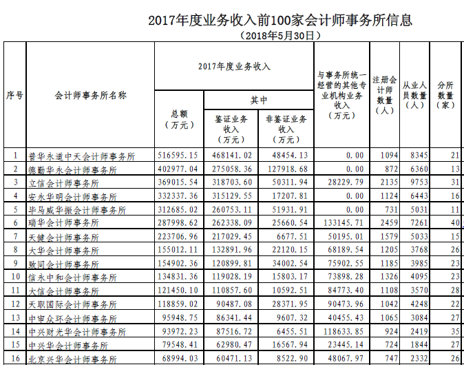 在2017年业务收入百强排行榜中,普华永道中天会计事务所位居榜首,2017年业务收入总额达到51.66亿元,其中,鉴证业务收入达到46.81亿元,非鉴证业务收入达到4.85亿元;从业人员数量达到8345人,其中,注册会计师数量为1094人,占总人数的13.1%。排名第二是的德勤华永会计事务所,2017年业务收入总额达到40.30亿元,其中,鉴证业务收入达到27.50亿元,非鉴证业务收入达到12.79亿元;从业人员数量达到6360人,其中,注册会计师数量为872人,占总人数的13.7%。立信会计师事务所位居第三,2017年业务收入总额达到36.90亿元,其中,鉴证业务收入达到31.87亿元,非鉴证业务收入达到5.03亿元;从业人员数量达到9753人,其中,注册会计师数量为2135人,占总人数的21.9%。