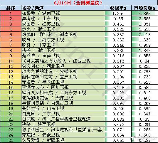 中商情报网讯:2018年6月19日(周二)全国网收视率排行榜上湖南卫视《如果爱》收视第一,昨日收视1.254%,市场份额4.866%。山东卫视《勇者胜》收视第二,当日收视0.65%,市场份额2.586%。江苏卫视《爱国者》收视第三,当日收视0.461%,市场份额1.851%。浙江卫视《走火》收视第四,昨日收视0.382%,市场份额1.516%。湖南卫视《像我们一样年轻》收视第五,周二收视0.363%,市场份额3.418%。上海东方卫视《脱身》排名第六,当日收视0.332%,市场份额1.339%。