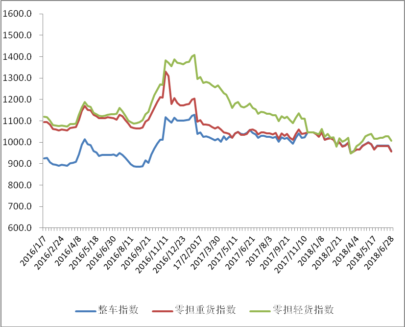 中商情报网讯:从中物联了解到,本周(2018年6月25日~6月29日),由中国物流与采购联合会和林安物流集团联合调查的中国公路物流运价指数967.37点,环比回落2.42%。