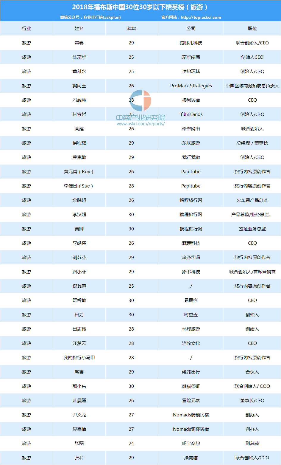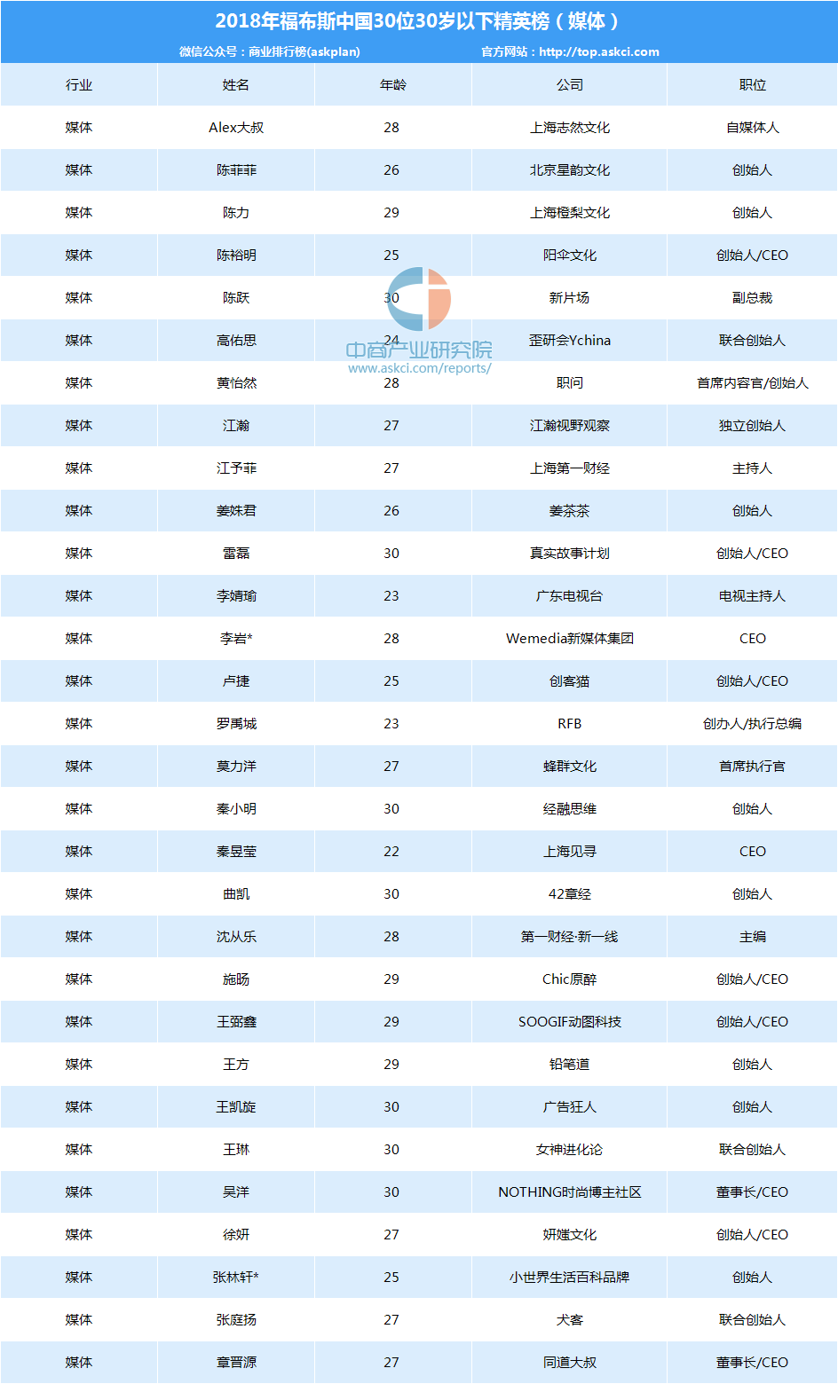 2018年福布斯中国30位30岁以下精英排行榜出炉(附各行业领域榜单)