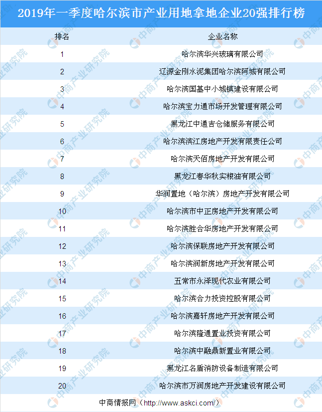 附:2019年一季度黑龙江哈尔滨市产业用地拿地企业20强排行榜