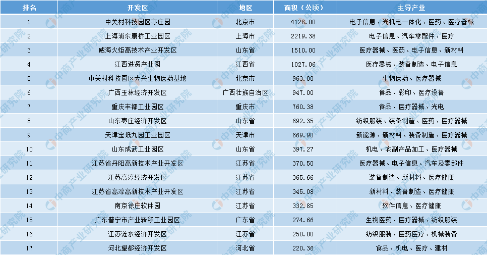 具体来看,位于北京市的中关村科技园区亦庄园面积最大,达4128公顷,主导产业包括电子信息、光机电一体化、医药、医疗器械。其次为上海市的上海浦东康桥工业园区、山东省的威海火炬高技术产业开发区、江西省的江西进贤产业园、北京市的中关村科技园区大兴生物医药基地。以上医疗开发区面积排名全国前五,合计达9847.44公顷。