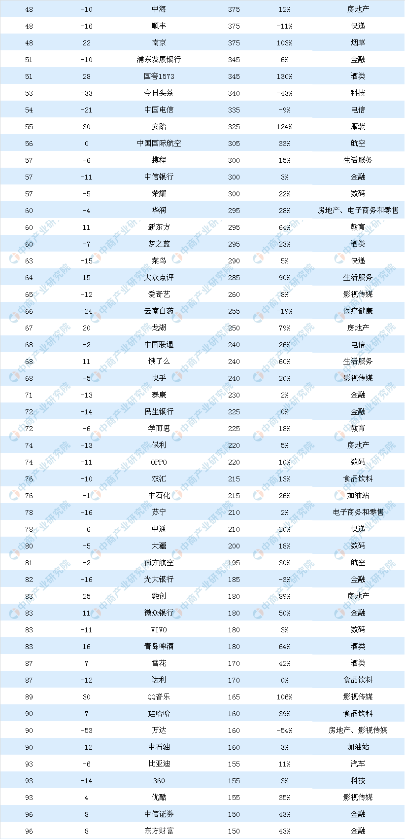 从行业来看:上榜品牌来自酒类、烟草、金融、房地产、电子商务、零售等多个行业。然而,金融和房地产仍然是上榜品牌数量最多的两大行业,金融业今年有40个品牌上榜,比去年增加1个;房地产行业今年有24个品牌上榜,比去年增加1个,这两大行业的上榜品牌数量占整张榜单三成;生活服务行业排列第三,有16个品牌上榜,比去年减少3个。在上榜品牌数量最多的十大行业中,品牌价值平均涨幅最大的是烟草行业,上涨178%;其次是酒类,上涨124%;生活服务行业上涨65%;食品饮料行业上涨51%;电子商务和零售行业上涨36%;影视传媒行业上涨30%;房地产行业上涨17%;金融行业上涨14%;数码行业上涨9%;医疗健康行业微幅下跌1%。