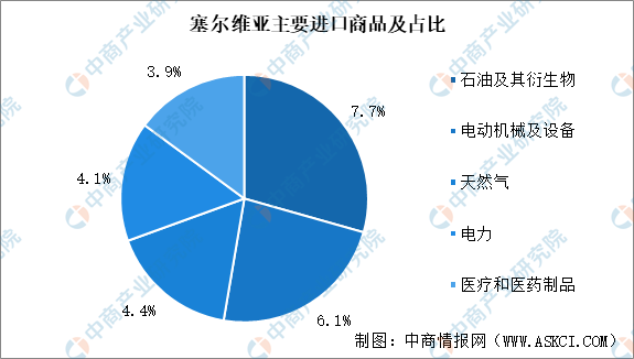 塞尔维亚主要进口商品为石油及其衍生物(占7.7%)、电动机械及设备(占6.1%)、天然气(占4.4%)、电力(占4.1%)、医疗和医药制品(占3.9%)。