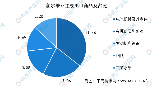 在塞尔维亚对外贸易中,原料性商品出口所占比重较大。塞尔维亚主要出口商品为电气机械及其零件(占出口总额比例11.4%)、金属矿石和矿渣(占7.0%)、发动机和设备(占5.0%)、钢铁(占4.4%)、蔬菜水果(占4.2%)。