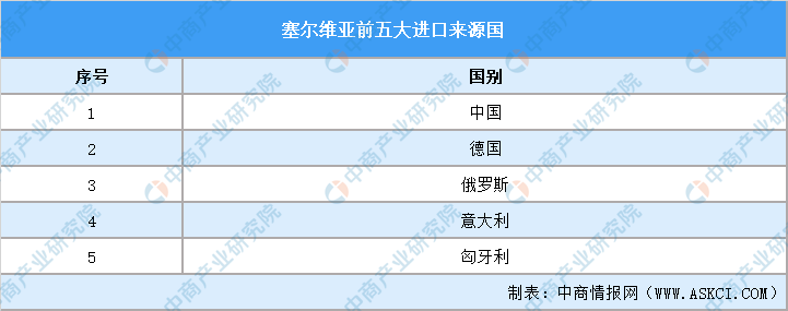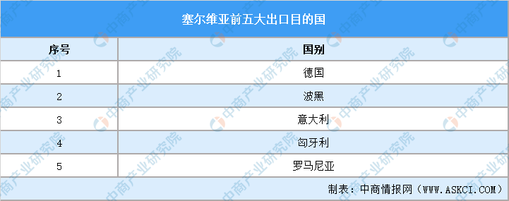 塞尔维亚前五大出口市场是:德国、波黑、意大利、匈牙利和罗马尼亚;前五大进口来源地是:中国、德国、俄罗斯、意大利和匈牙利。