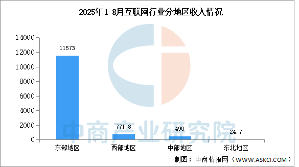 中商情报网讯:东部地区和西部地区互联网业务收入增速较快。1—8月份,东部地区完成互联网业务收入11573亿元,同比增长4.1%;西部地区完成互联网业务收入771.8亿元,同比增长5%;东北地区完成互联网业务收入24.7亿元;中部地区完成互联网业务收入490亿元。