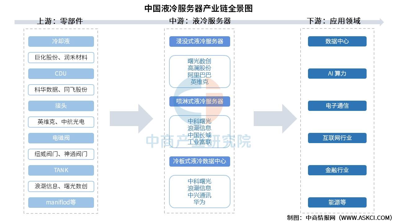 液冷服务器产业链上游为冷却液、接头、CDU(冷却液分配单元)、电磁阀、TANK、manifold等零部件;中游为液冷服务器可分为浸没式液冷服务器、喷淋式液冷服务器、冷板式液冷服务器;下游应用于数据中心、AI算力、电子通信、互联网行业、金融行业、能源、交通等领域。
