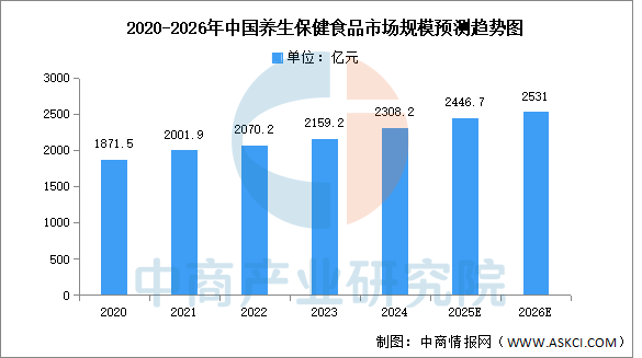 近年来,随着老龄化程度的加深和居民健康意识的提升,中国保健食品市场规模持续扩张。中商产业研究院发布的《2025-2030年中国保健食品深度分析及发展前景研究预测报告》显示,2024年中国养生保健食品市场规模达到2308.2亿元,较上年增长6.9%。中商产业研究院分析师预测,2025年中国养生保健食品市场规模将达到2446.7亿元,2026年预计将达2531亿元。