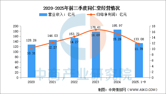 2025年前三季度实现营业收入219.86亿元,同比增长11.38%;实现归母净利润23.53亿元,同比下降20.51%。2025年上半年主营产品包括医药行业-自我诊疗(CHC)、医药行业-处方药,药品、器械批发及零售,营收分别占整体的53.98%、32.67%、11.75%。