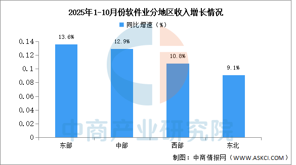 前10个月,东部地区、中部地区、西部地区和东北地区软件业务收入分别同比增长13.6%、12.9%、10.8%和9.1%。东部地区软件业务收入占全国的83.5%。