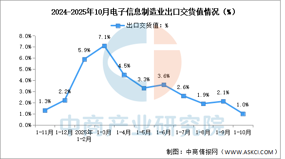 1—10月,规模以上电子信息制造业累计实现出口交货值同比增长1.0%,较1—9月回落1.1个百分点。
