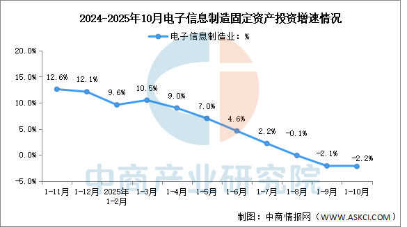 1—10月,电子信息制造业固定资产投资同比下降2.2%,较1—9月回落0.1个百分点,比同期工业投资增速低7.1个百分点。