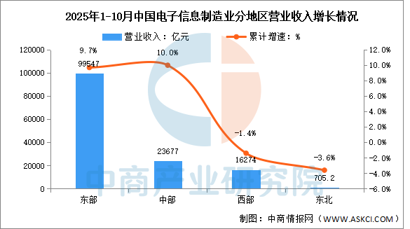 1—10月,规模以上电子信息制造业东部地区实现营业收入99547亿元,同比增长9.7%,较1—9月回落0.4个百分点;中部地区实现营业收入23677亿元,同比增长10%,较1—9月回落0.6个百分点;西部地区实现营业收入16274亿元,同比下降1.4%,较1—9月回落1.2个百分点;东北地区实现营业收入705.2亿元,同比下降3.6%,较1—9月提高0.7个百分点。10月份,东部地区实现营业收入10733亿元,同比增长6.1%;中部地区实现营业收入2964亿元,同比增长5.7%;西部地区实现营业收入1522亿元,同比下降11.8%;东北地区实现营业收入69.2亿元,同比增长3.8%。
