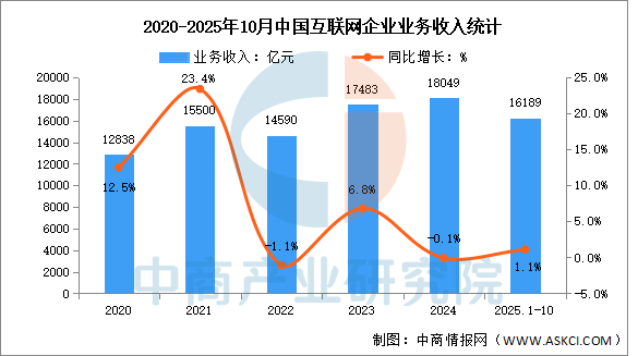 中商情报网讯:互联网业务收入平稳增长。1—10月份,我国规模以上互联网和相关服务企业完成互联网业务收入16189亿元,同比增长1.1%,增速较前三季度下降1.7个百分点。