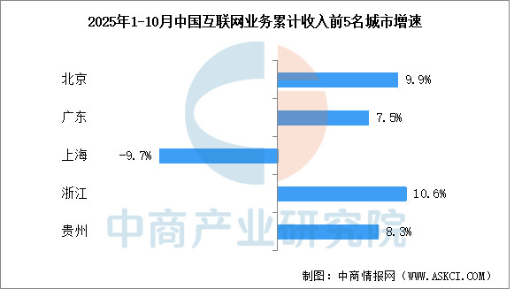 三成地区互联网业务增速实现正增长。1—10月份,互联网业务累计收入居前5名的北京(增长9.9%)、广东(增长7.5%)、上海(下降9.7%)、浙江(增长10.6%)和贵州(增长8.3%)共完成业务收入13639亿元,同比增长4.4%,占全国(扣除跨地区企业)互联网业务收入的84.2%。全国互联网业务收入实现正增长的省(区、市)有10个,其中内蒙古、河北、浙江增速超10%。