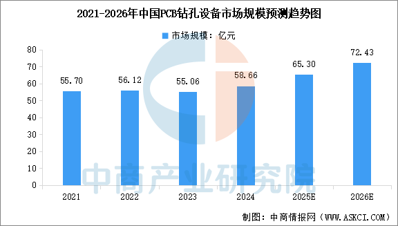 钻孔设备是最大的细分市场,中商产业研究院发布的《2025-2030全球与中国PCB设备市场现状及未来发展趋势》显示,2024年中国PCB钻孔设备市场规模为58.66亿元,较上年增长6.54%。中商产业研究院分析师预测,2025年中国PCB钻孔设备市场规模将达到65.30亿元,2026年市场规模将达到72.43亿元。