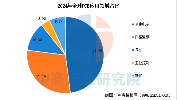PCB的应用已渗透到几乎所有电子设备中,但其市场正经历结构性变化,传统消费电子需求趋稳,而AI与算力、汽车电子、先进通信等新兴领域正成为行业增长的核心引擎。中商产业研究院发布的《2025-2030全球与中国PCB设备市场现状及未来发展趋势》显示,PCB应用领域中,占比最大的是消费电子,达到47.9%。其次是数据通讯、汽车、工业控制,分别占比29.1%、12.3%、3.9%。