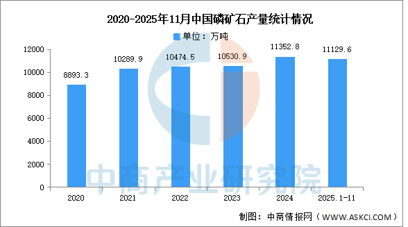 磷矿石是以磷灰石为主要成分的含磷矿石,主要分布于云南、贵州、四川、湖北等地。中商产业研究院发布的《2025-2030年中国磷矿及磷化工行业现状调研及发展前景投资预测分析报告》显示,2025年1-11月,中国磷矿石产量达11129.6万吨,同比增长10.4%。