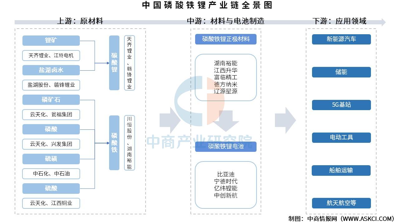 磷酸铁锂电池产业链上游为原材料,包括锂矿、盐湖卤水、磷矿石、磷酸、硫磺、硫酸,通过磷化工及提纯等方式,生成磷酸铁锂主要原材料碳酸锂及磷酸铁;中游为磷酸铁锂正极材料和磷酸铁锂电池;下游应用于新能源汽车、储能、电动工具、5G基站、船舶运输、航空航天等领域。