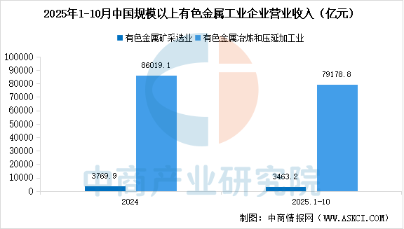 中国规模以上有色金属企业收入继续保持较快增长。中商产业研究院发布的《2025-2030年全球有色金属行业市场调研及投资前景预测报告》显示,2024年,中国规模以上有色金属矿采选业企业实现营业收入3769.9亿元,增长8.9%,规模以上有色金属冶炼和压延加工业企业实现营业收入86019.1亿元,增长16.1%。2025年1-10月,中国规模以上有色金属矿采选业企业实现营业收入3463.2亿元,增长14.1%,规模以上有色金属冶炼和压延加工业企业实现营业收入79178.8亿元,增长14.2%。