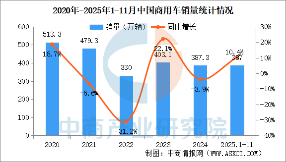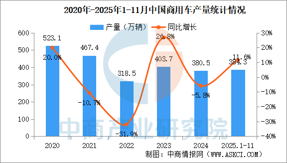 中商情报网讯:2025年11月,商用车产销分别完成38.8万辆和39.2万辆,环比分别增长6.6%和8.6%,同比分别增长18.6%和24.4%。2025年1-11月,商用车产销分别完成384.3万辆和387万辆,同比分别增长11.6%和10.4%。