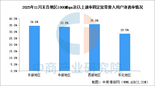 各地区千兆、5G用户渗透率持续提升。截至11月末,东、中、西部和东北地区1000Mbps及以上固定宽带接入用户渗透率分别为34.6%、33.8%、35.8%和28.5%,较上年末分别提升3.4个、2.6个、4.1个和4.9个百分点;5G移动电话用户渗透率分别为64.9%、65.9%、65.1%、65.9%,较上年末分别提升8.2个、8.7个、8.8个和9.6个百分点。