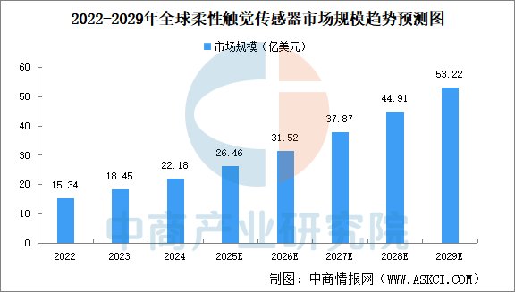 近年来,全球柔性触觉传感器市场规模近年来呈现快速增长趋势。中商产业研究院发布的《2025-2030年全球柔性触觉传感器市场调查与行业前景预测专题研究报告》显示,2022年全球柔性触觉传感器市场规模15.34亿美元,2024年增至22.18亿美元。中商产业研究院分析师预测,2025年全球柔性触觉传感器市场规模将达26.46亿美元,2029年全球柔性触觉传感器市场规模将达到53.22亿美元。