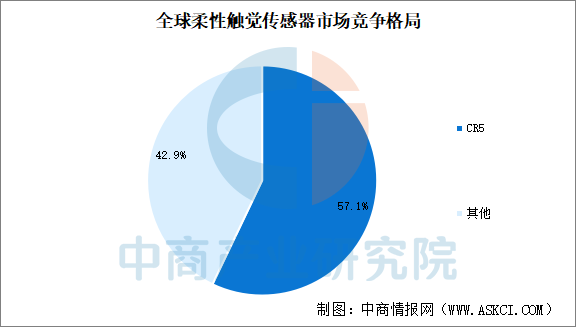 (三)柔性触觉传感器竞争格局柔性触觉传感器技术仍由国外企业领先,市场以国外厂商为主,全球前五大厂商占有大约57.1%的市场份额。