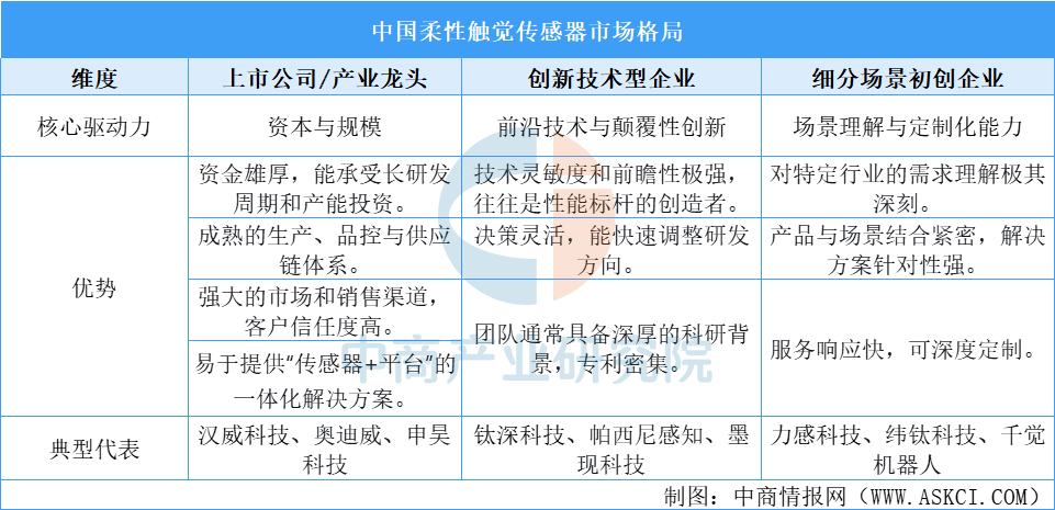 中国柔性触觉传感器市场已形成层次分明、协同演进的立体格局:以汉威科技、奥迪威、申昊科技为代表的上市公司/产业龙头,凭借其资本实力、规模化的生产与成熟的渠道体系,扮演着产业整合与市场引领的角色;以钛深科技、帕西尼感知、墨现科技为代表的创新技术型企业,则依托前沿技术、灵活机制和深厚的科研背景,专注于高性能与颠覆性创新,不断突破技术上限;而诸如力感科技、纬钛科技、千觉机器人等细分场景初创企业,则深扎特定应用领域,凭借对行业需求的深刻理解和高度定制化的解决方案,在垂直场景中构建起差异化优势。