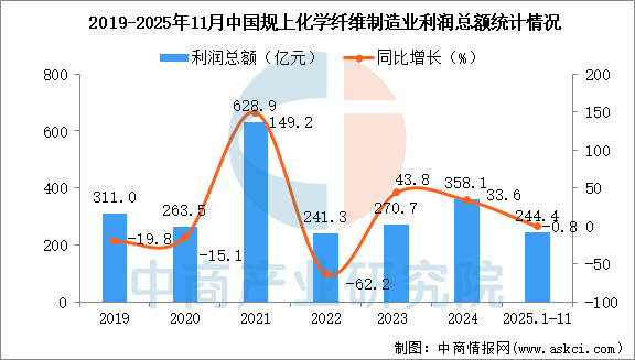 2025年1-11月,全国规模以上化学纤维制造业营业收入9445.6亿元,同比下降6.9%;营业成本8698.9亿元,同比下降7.4%;利润总额244.4亿元,同比下降0.8%。