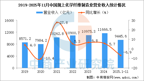 中商情报网讯:2025年1-11月,全国规模以上化学纤维制造业企业营业收入、营业成本出现同比下降,利润总额出现同比下降。