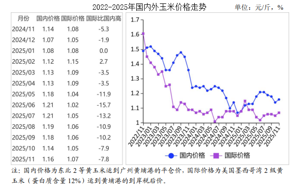 中商情报网讯:2025年11月,国内外玉米价格均小幅上涨。国内市场:下游企业库存同比偏低,存在补库需求,玉米增产较多,产需基本平衡,预计后期价格上涨空间有限。国际市场:全球玉米丰产预期较强,乙醇行业对玉米的需求增幅有限,预计后期国际价格震荡偏弱运行。