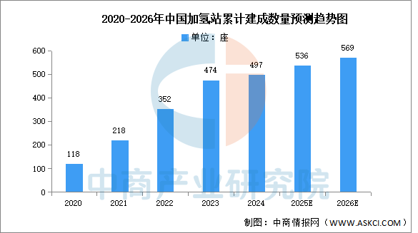 近年来,中国已累计建成加氢站约占全球加氢站数量的40%,加氢站数量位居世界第一。中商产业研究院发布的《2025-2030年中国加氢站行业深度分析及发展前景预测报告》显示,加氢站建设数量在2024年减少、增速放缓,主要是受市场需求、高额投建运营成本这两大因素的影响。截至2024年12月底,国内累计建成加氢站497座。中商产业研究院分析师预测,2025年中国加氢站建成数量将达536座,2026年将保持小幅增长,达569座。