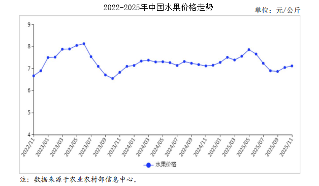 中商情报网讯:2025年11月,水果价格小幅上涨。后期水果市场总体供给充足,以应季柑橘和库存苹果、梨为主,受年底节假日消费拉动,预计水果价格季节性上涨。