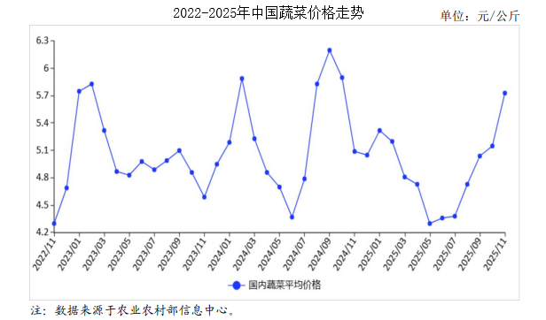 中商情报网讯:2025年11月,蔬菜价格持续上行。蔬菜主产地南移、“南菜北运”规模扩大,市场供应有保障。随着气温下降,生产、流通、交易等成本均有所提高。若不出现灾害性天气,预计后期蔬菜市场运行总体平稳,价格将在较高水平波动。