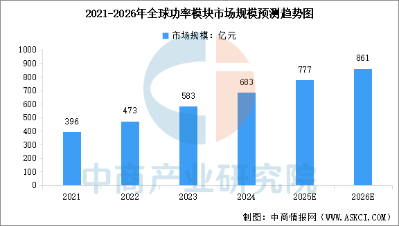 中商情报网讯:功率模块是一种把功率器件及被动零部件按特定功能组合后进行灌封、封装的高集成度电子单元,是电控系统最重要的部件之一。全球功率模块市场在新能源汽车等需求带动下保持增长。中商产业研究院发布的《2025-2030年中国功率模块行业市场现状调研及发展趋势预测研究报告》显示,2020年至2024年全球功率模块市场规模由294亿元增长至683亿元,复合年增长率约23.5%。中商产业研究院分析师预测,2026年全球功率模块市场规模将达到861亿元。