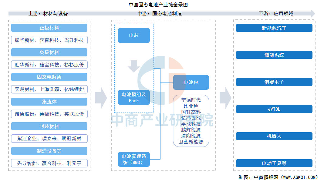 固态电池产业链上游为材料及设备,包括正极材料、负极材料、固态电解质、集流体、封装材料、制造设备等;中游涵盖固态电池的制造环节,包括电芯设计生产、封装集成、电池管理系统(BMS)开发以及模组/Pack系统集成;下游应用领域广泛,覆盖新能源汽车、储能系统、消费电子、电动垂直起降航空器(eVTOL)以及机器人等。