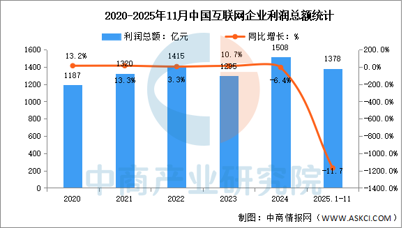 利润总额降幅基本稳定。1—11月份,我国规模以上互联网企业实现利润总额1378亿元,同比下降11.7%,降幅较1—10月份扩大了0.8个百分点。