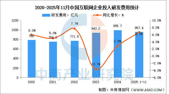 研发经费增速放缓。1—11月份,我国规模以上互联网企业共投入研发经费957.4亿元,同比增长6.7%,增速较1—10月份回落了0.4个百分点。
